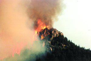 In 2002 the Grizzly Gulch fire started in hills southeast of Deadwood. The fire quickly spread to the city limits and White Rocks was engulfed in flames. Although the fire was devastating to this area and to the people who lost their homes, the regrowth almost 20 years later is magnificent. Pic of flames topping White Rocks:
