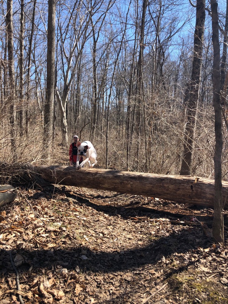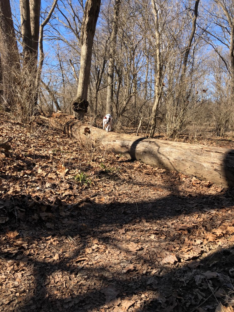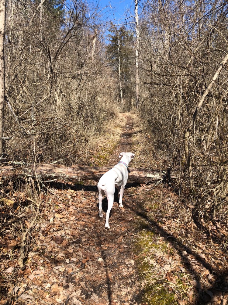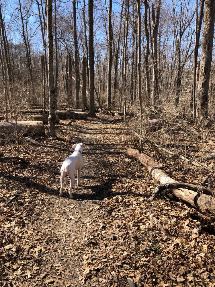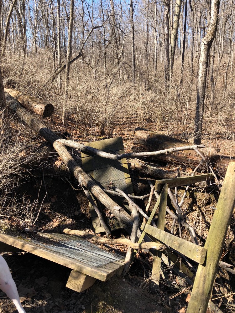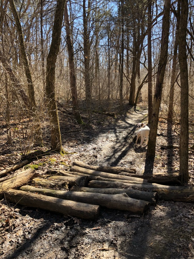 The trail is mostly flat through the Pine Loop but starts to become hilly the closer it gets to the Kramer Preserve. Due to recent rainfall parts of the trail were quite muddy. I actually fell pretty hard going down a hill that was extremely slippery from the mud. Luckily the only thing I hurt was my butt which I landed on. After hiking for a mile and a half we come to the Kramer Preserve junction. Since this is a loop hikers can choose to go either route at the junction, we choose the eastern route. As the trail descends into forest we come to a collapsed bridge. We could easily see the trail on the other side of the creek but had to take a few minutes to evaluate the easiest way to get down the muddy hillside and across the creek. Once back on the trail we followed the half mile loop through the mature wood-lot.