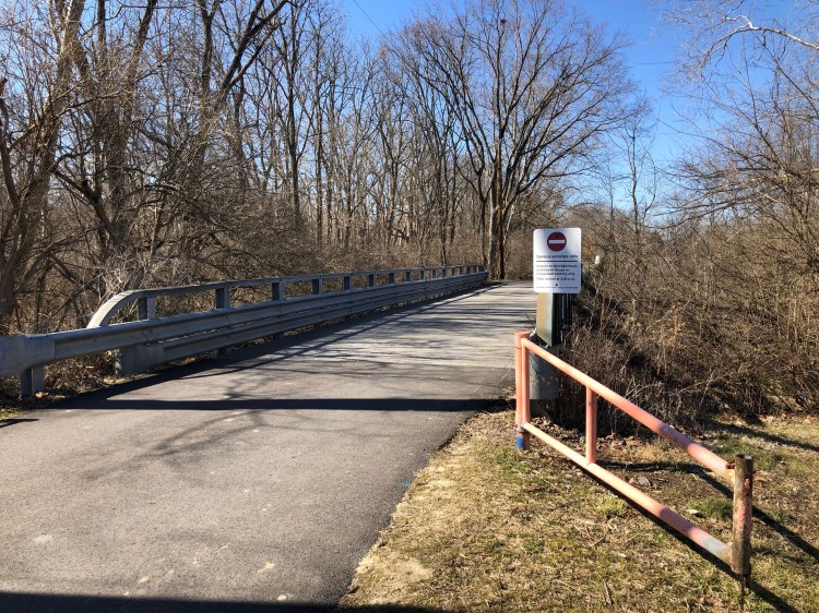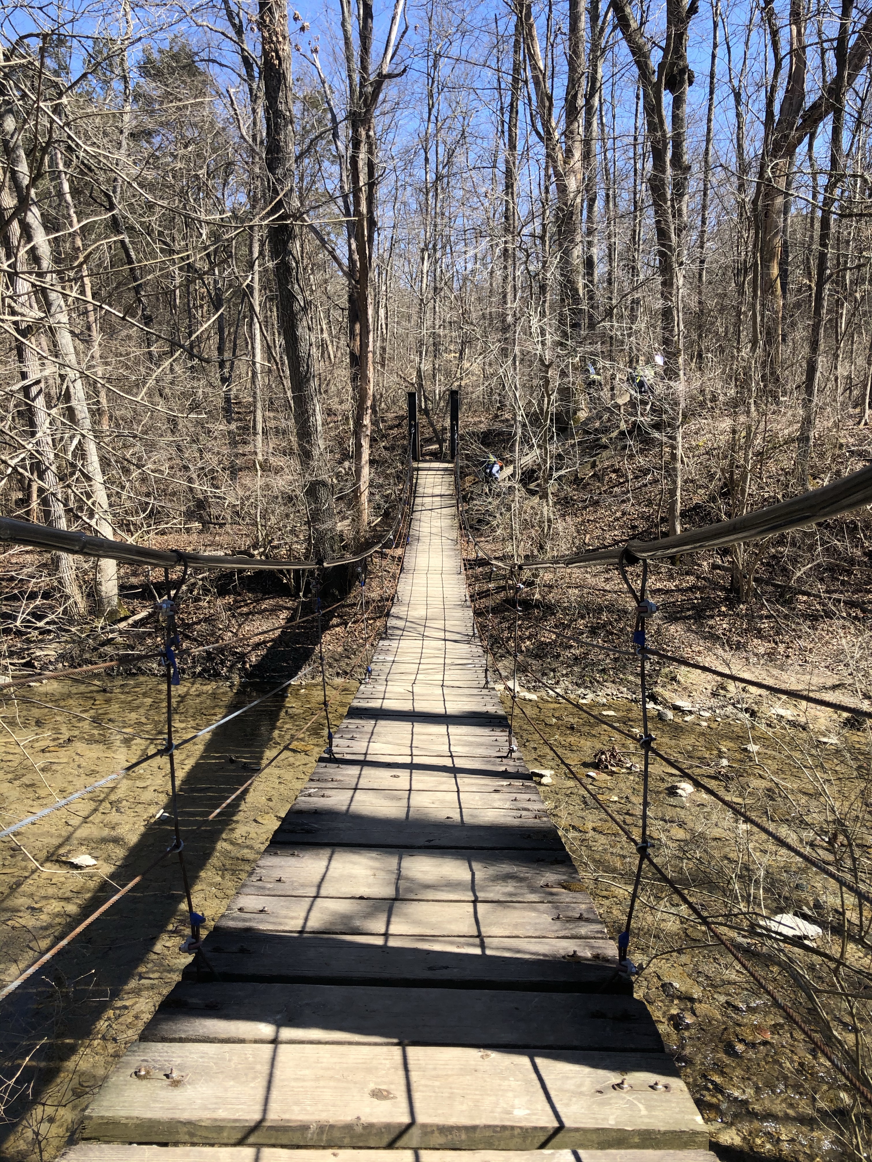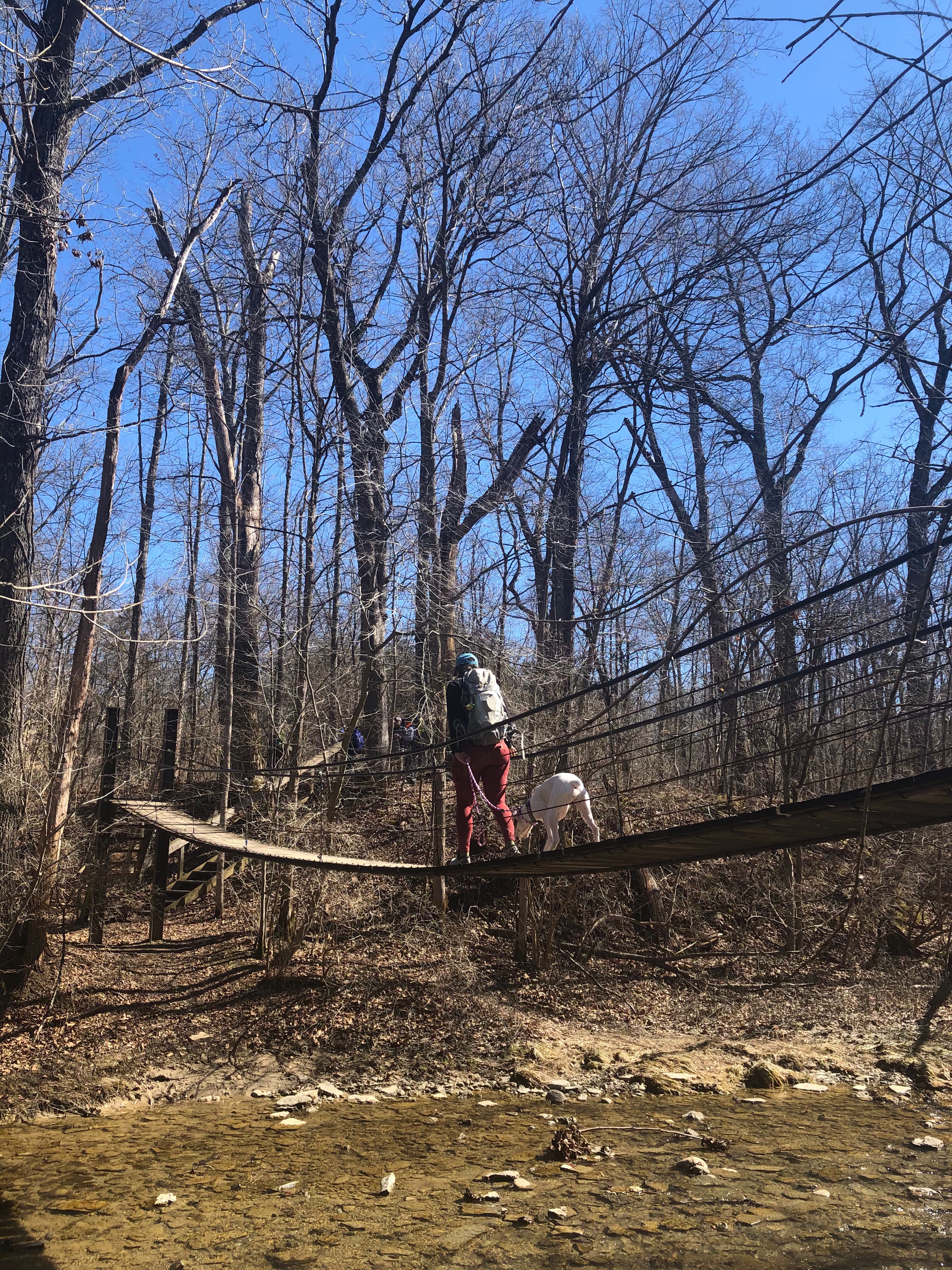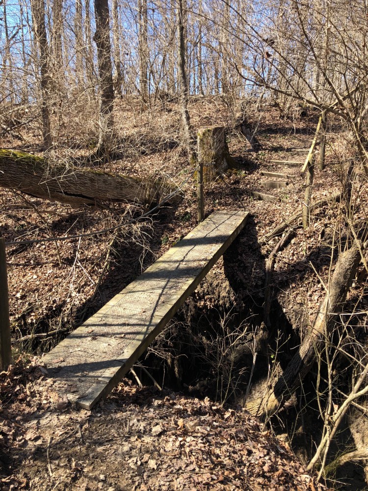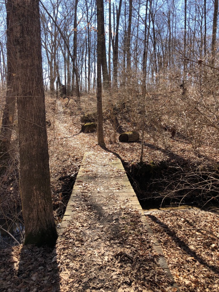 After leaving Kramer Preserve the trail heads back towards the Bachelor Preserve. Within a tenth of mile the trail meets up with the northwest junction of the North Loop. We turned left heading east along the top section of the North Loop and it wasn’t long before we came to the northeast junction of the North Loop. To get to the Eastern Loop we continued east, crossing Bonham Rd where the trail starts heading south as it meets back up with Harkers Run creek. As we approach the 3.5 mile mark we come to the junction of the Eastern Loop. We head across Harkers Run creek via the suspension bridge making our way into the Eastern Loop.