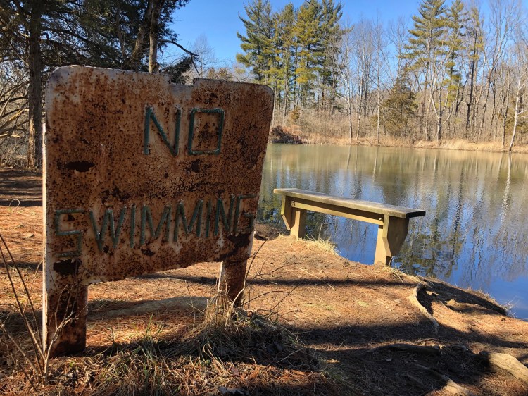 After crossing the bridge we continue northeast ascending up the well worn muddy trail. We make our way toward Bachelor Pond which is only 1 kilometer from the suspension bridge. As we approach Bachelor Pond we come to the Rhinehart Preserve Loop junction, we take a right heading south around the pond. According to www.users.miamioh.edu Bachelor Pond was a well known skinny dipping spot for students back in the sixties. The No Swimming signs that line the banks of the pond date back to this period when the pond was considered a health hazard.
