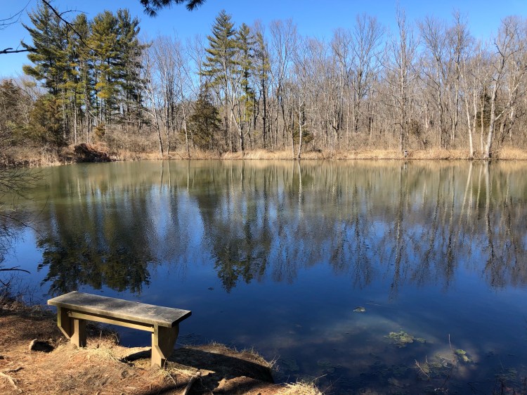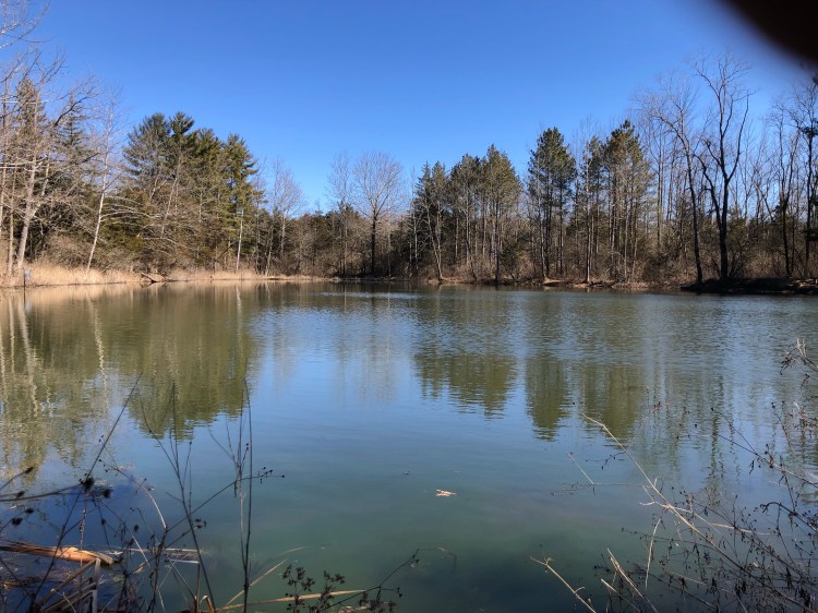 We come upon the next junction on the south side of Bachelor Pond. We head south on the Eastern Loop making our way back towards Harkers Run creek. The Eastern Loop takes you through several different types of forest. After leaving the pond we pass a section of redbud trees and cross into an area monopolized by red cedar and honeysuckle. The trail crosses a foot bridge and then intersects with a trail to Boesel Pond. We continued south on the Eastern Loop heading into upland forest of white and red oak, sugar maple, American beech, ash, black cherry and shagbark hickory trees. The trail through this forest is quiet and has an open feel to it. At 4.75 miles we meet back up with Harkers Run creek and cross via the concrete pillars.
