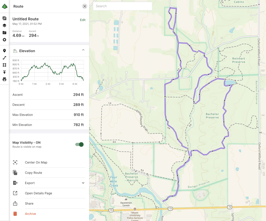 Spanning over 400 acres the Bachelor Preserve consists of three trails, the North Loop, the Pine Loop, and the Eastern Loop. Although there are many ways to access the trails within these preserves we parked at the Dewitt Cabin Parking area, off Oxford Trenton Rd. The trails in this system are very easy to follow with maps of the area and a ‘you are here’ notation at every junction. Our plan for the day was to follow the western perimeter of the Bachelor Pine and North Loop towards the Kramer Preserve and then finishes the day in the Eastern Loop. We found the start of the trail after crossing the concrete bridge, from here the trail follows along Harker Run creek for about 1 kilometer before coming to the first of many junctions. At this junction hikers can head east across Harkers Run creek towards the Eastern Loop or continue north into the Pine Loop. We continued north and within 800 feet came to the 2nd junction as the trail comes to the head of the Pine Loop trail. We stayed to the left continuing towards the North Loop on our way to Kramer Preserve.
