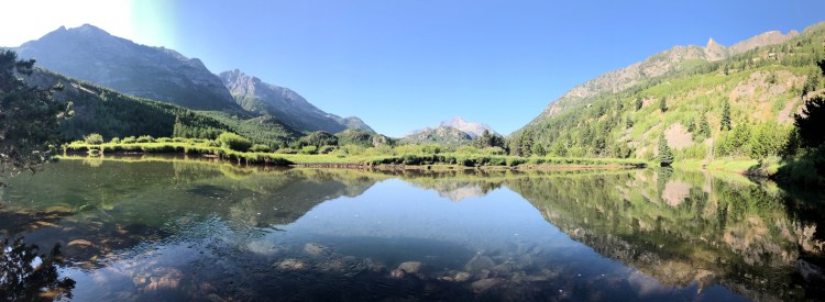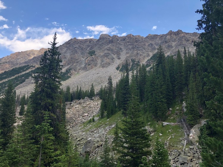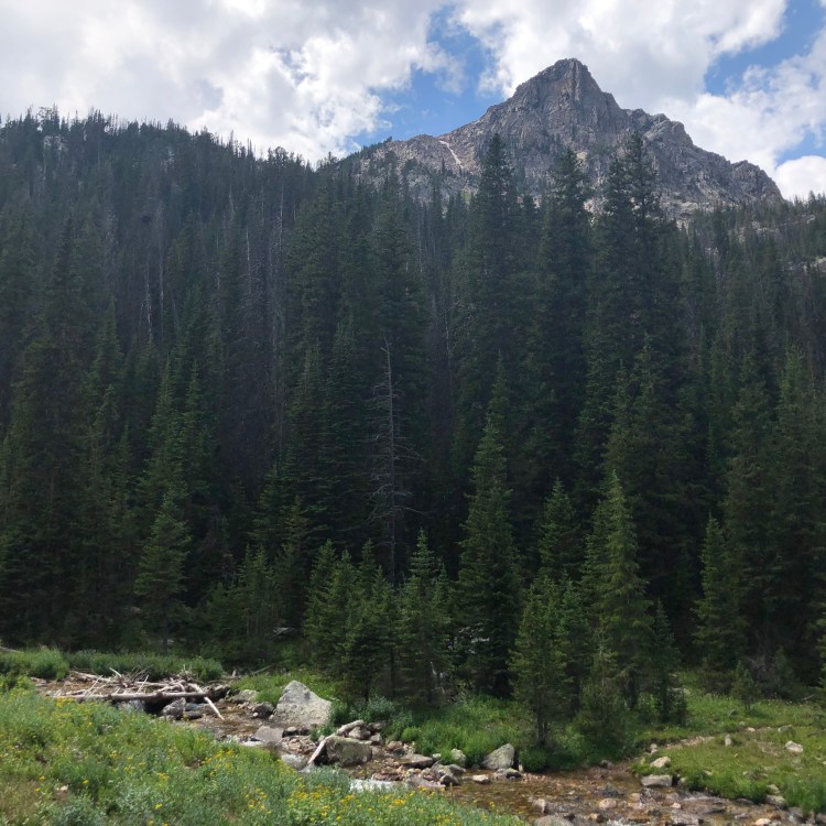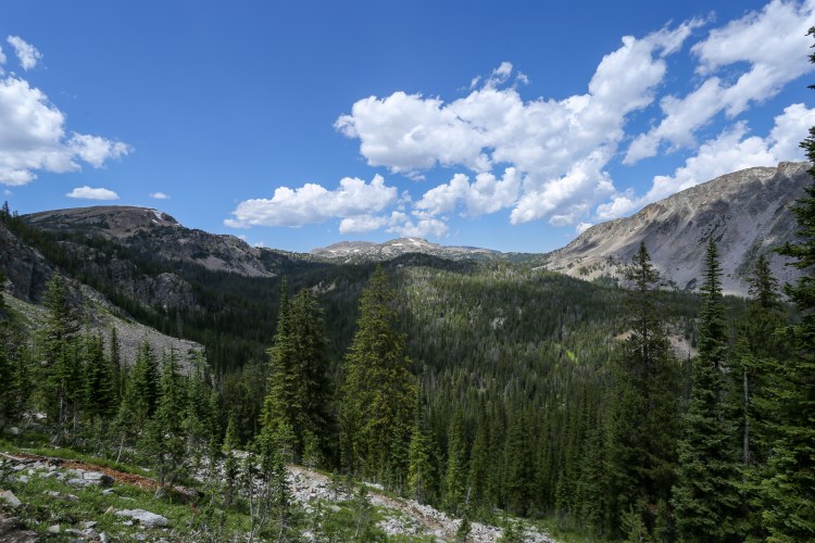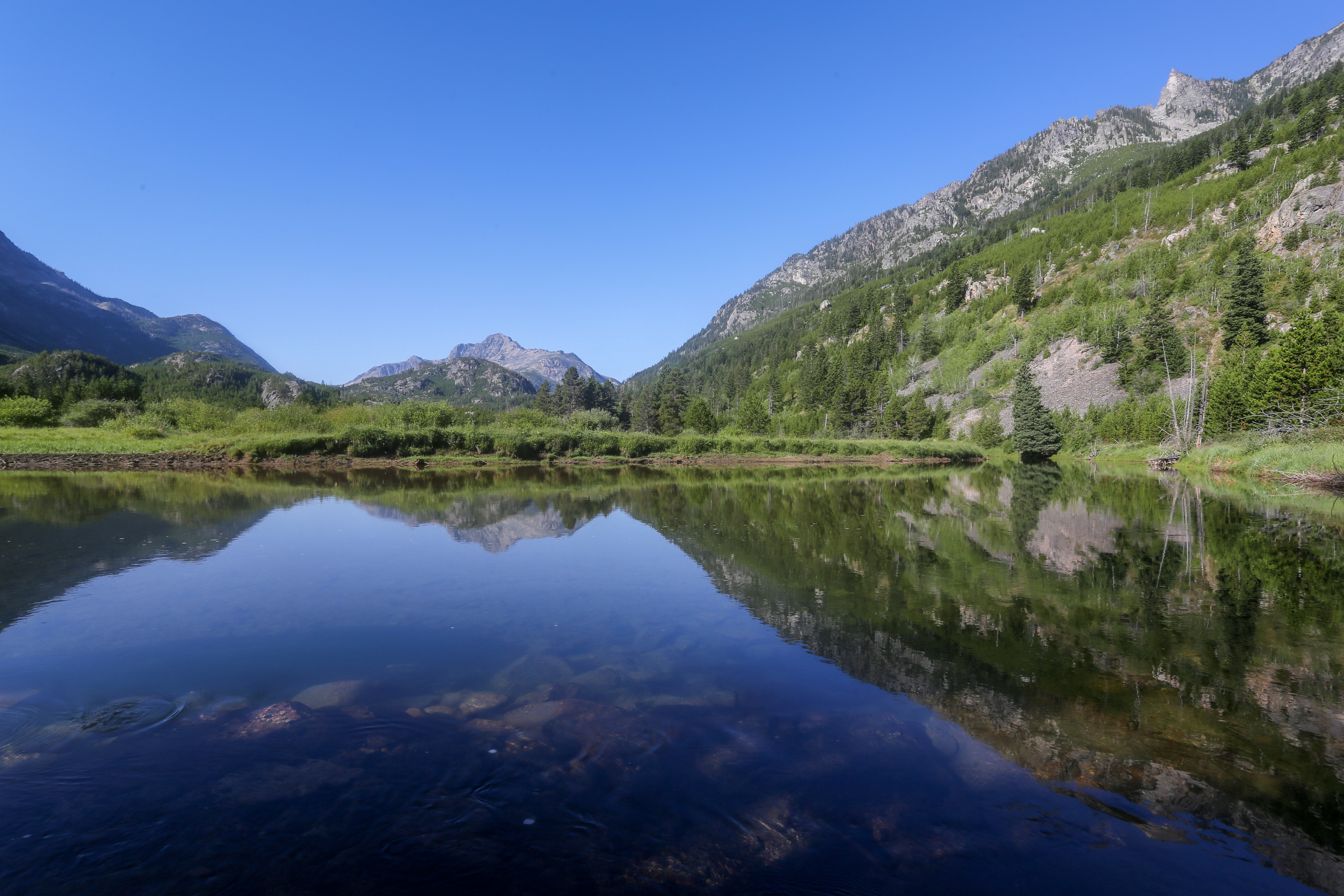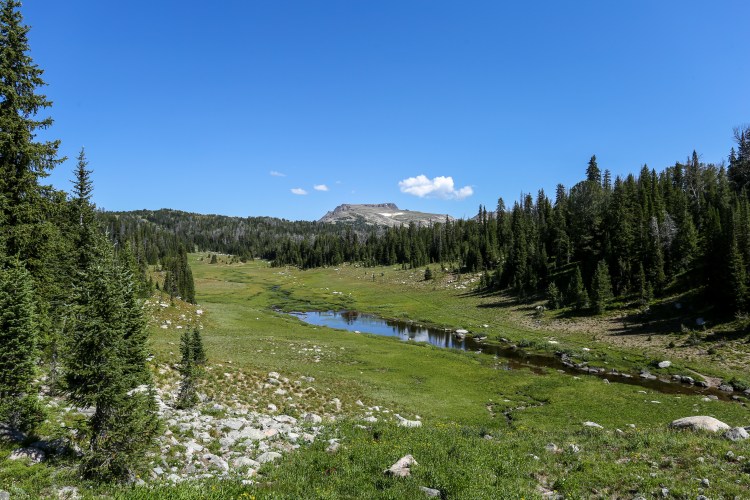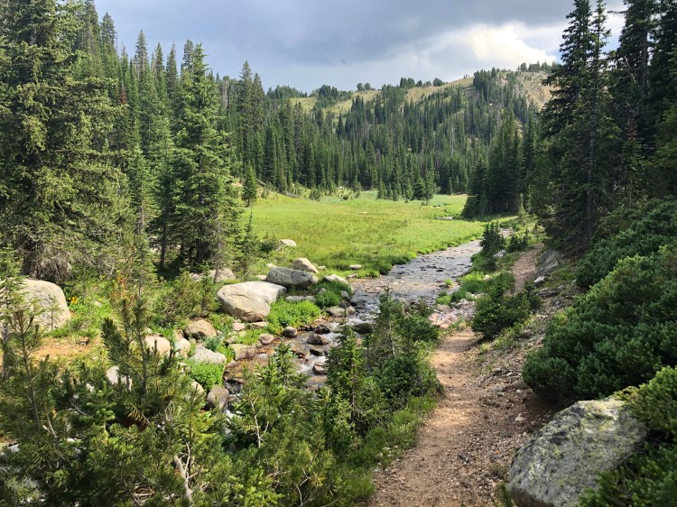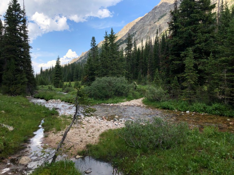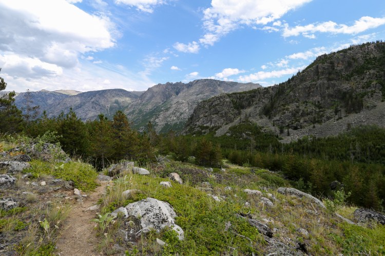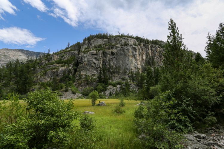 Day 2 begins just as beautiful as day 1. After eating breakfast and packing up our stuff we head out towards Lake Diaphanous. We are once again treated to a bright blue sky as we cross this mile long mountain meadow. The trail through Breakneck Meadows seems to go on forever but we were thankful for the easy grade as we know the ascent to Lake Diaphanous will be tough. After leaving the meadow the trail meets back up with the West Stillwater river and follows it for the next few miles. At about mile 12 the grade becomes steep for about a mile before it levels back out again. There are quite a few river crossings within this stretch so we take advantage of the easy grade and keep our water shoes on until the final ascent. At one point a young couple with a dog pass us but they are the only people we see on this day.