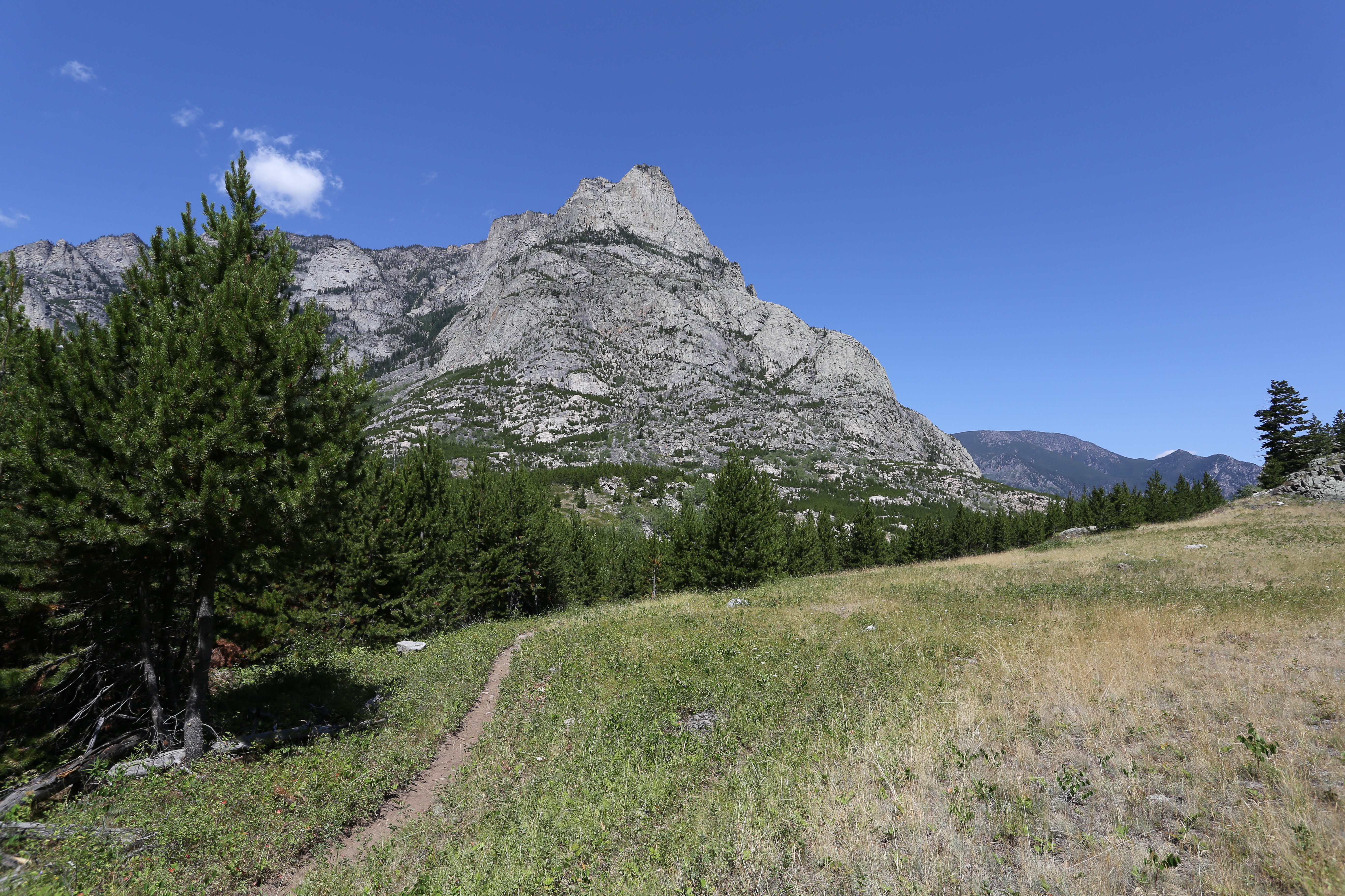 Day 5 we wake up to another gorgeous blue sky day. We take our time packing up camp and enjoy the stillness of the morning. As we head down the trail we reflect on the past 4 days, although this is our last day we still have 8 miles ahead of us. The trail continues north as it heads toward Tripod Point, past Cathedral Peak and down to Sioux Charley Lake.