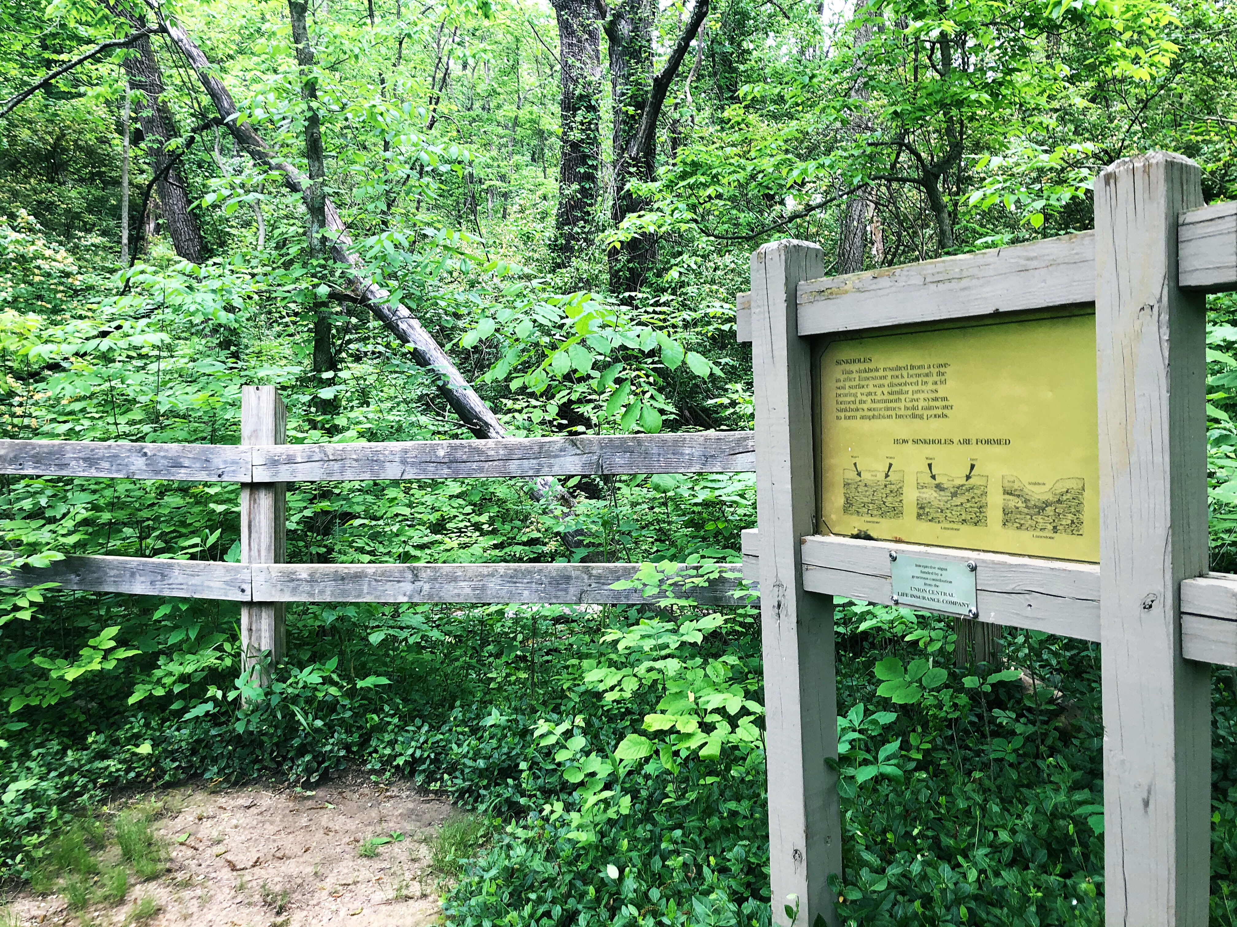 At the top of the stairs the trail crosses a boardwalk and then ascends over the next two tenths of a mile. The woodland section of the trail passes through a mixed forested habitat. A variety of trees and shrubs provide habitat for a wide variety of animals. At the .90 mile the trail passes a sinkhole, this was created when limestone rock under the surface dissolved due to acidic water resulting in a cave-in. We continue descending down the trail for another tenth of a mile before coming to the end of the loop.