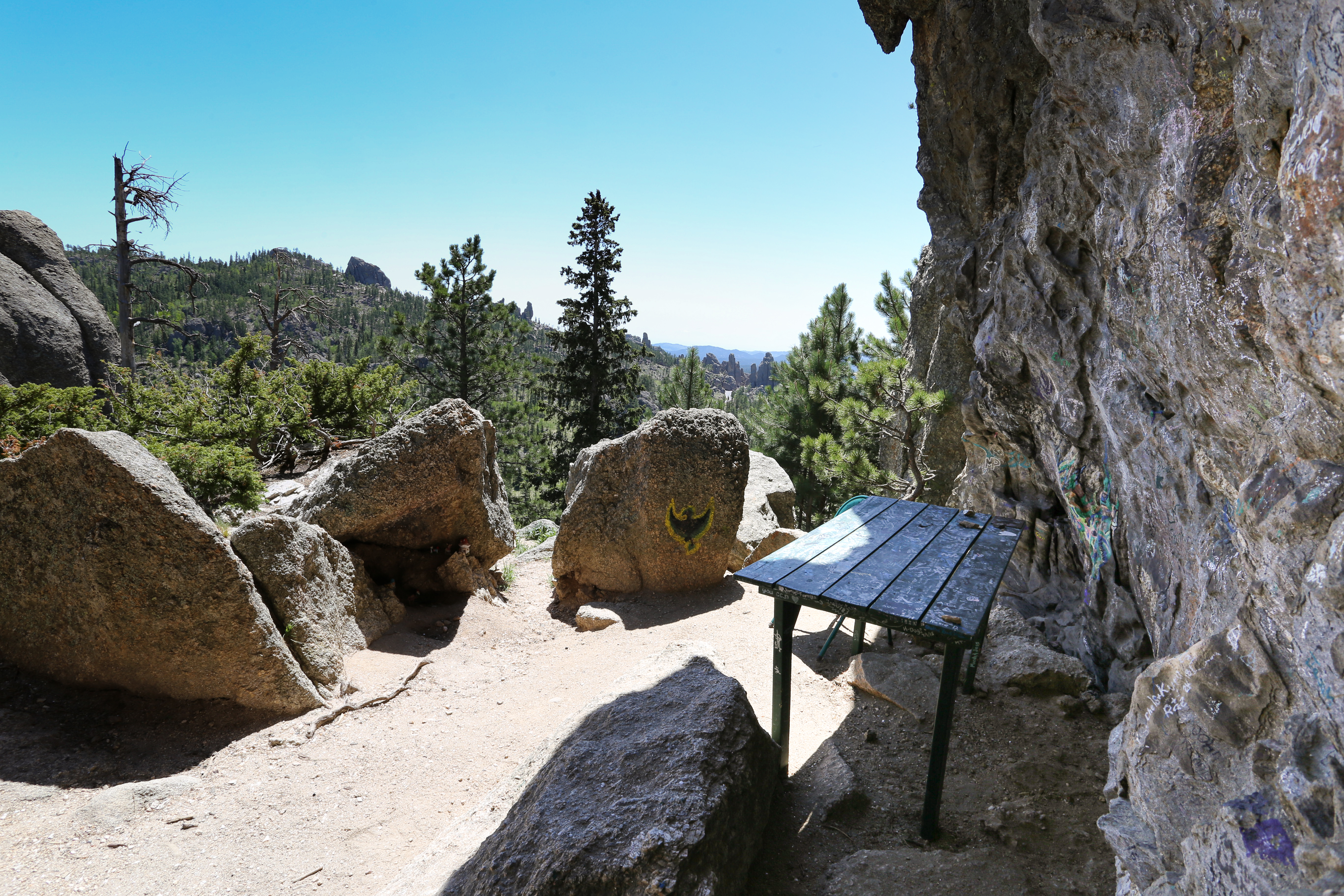 Hidden among the granite peaks of Custer State Park, Poet’s Table is a local treasure that cannot be found on any trail maps. It is a unique spot that is meant for curious adventurers, those who don’t mind getting lost in the woods. Growing up in the Black Hills, Poet’s table was something I had always heard about but had never ventured to find myself. Intrigued by the history of Poet’s Table I made it my mission to find this legendary site on our latest trip back home. Plenty of clues on how to find Poet’s Table can found on the internet so I am not going to divulge any here. Just know that what you’re looking for may actually be behind you.
